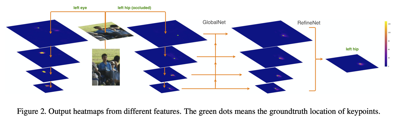 이 논문에서는 이러한 한계를 극복하고 분류하기 어려운 hard keypoints를 잘 검출하기 위해서 두 개의 stage로 이루어진 CPN을 제안한다. (GlobalNet + RefineNet)