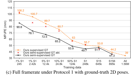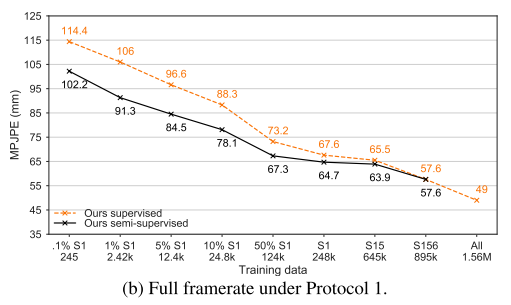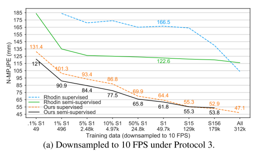 5b는 다운샘플링 되지 않은 데이터 세트 버전(50 FPS)에 대해 일반적인 프로토콜 1에 따른 결과를 보여준다. 이러한 설정은 비디오에서 전체 시간 정보를 활용할 수 있기 때문에 우리의 접근방식에 더 적합하다. 여기서 27개의 프레임의 receptive field 를 사용한다. 단, 9개 프레임을 사용하는 S1 의 1%와 하나의 프레임을 사용하는 S1의 0.1%를 제외하고서를 말한다. semi-supervised 접근방식은 supervised 기준에서 최대 14.7mm MPJPE를 얻는다.