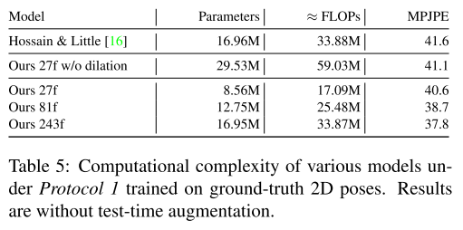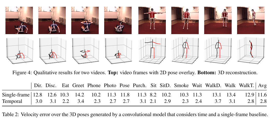 또한 3차원 자세 시퀀스의 1차 도함수의 MPJPE에 해당하는 관절 속도 오류(MPJVE, measure joint velocity error)를 측정한다. 표 2는 본 논문의 모델이 단일 프레임 기준의 MPJVE를 평균적으로 76% 감소 시켜 훨씬 더 부드러운 자세 추정 결과를 제공한다는 것을 보여준다. 또한 표 4에서는 HumanEva-I의 결과와 모델이 더 작은 데이터 세트로 일반화 되었음을 보여준다. 결과는 사전 훈련된 Mask R-CNN 2차원 탐지를 기반으로 한다. 이 모델은 SOTA를 능가하며, 마지막으로 표 5에서는 복잡도 측면에서 이전 연구(LSTM)와 컨볼루션 모델을 비교한다.