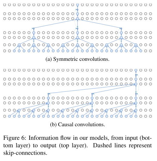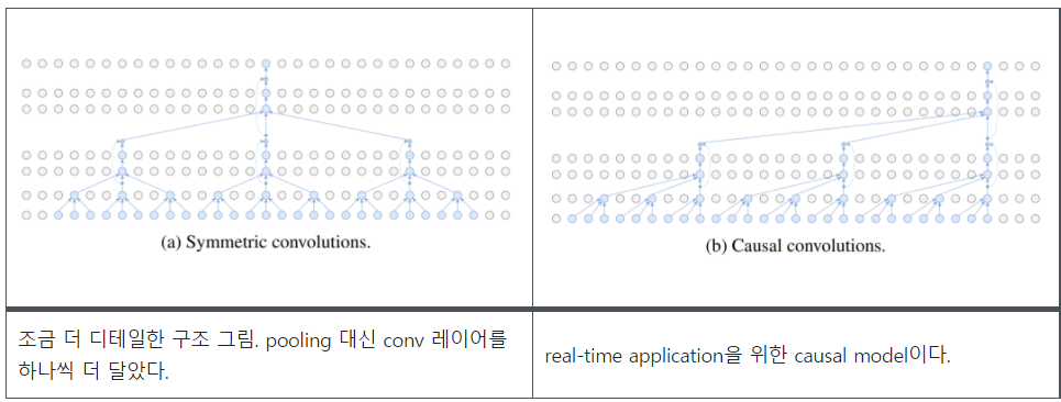 실시간 시나리오를 평가하기 위해 causal convolution 즉 과거 프레임에만 접근 할 수 있는 컨볼루션을 가지고 실험하게 되며, 컨볼루션 이미지 모델은 일반적으로 제로 패딩(zero-padding)을 적용하여 입력 만큼 많은 출력을 얻게 되는데 초기 실험은 왼쪽과 오른쪽의 경계 프레임 복제본으로 입력 시퀀스를 채우면서 패딩 되지 않은 컨볼루션 만 수행할 때 더 나은 결과를 보여주었다고 한다. 그림 2에서는 블록인 243 프레임의 receptive field 크기에 대한 구조의 인스턴스화를 보여준다. 컨볼루션 레이어에 경우 출력 채널로 을 설정하고 Dropout 비율 를 사용하였다.