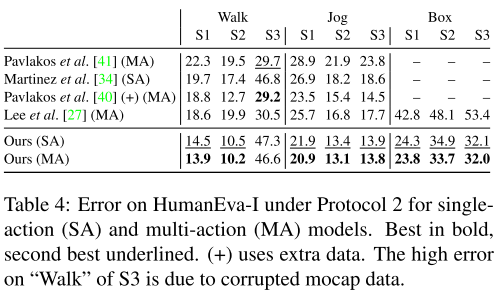 모든 행동에 대해 단일 모델을 훈련하게 되며, HumanEva-I는 60Hz 에서 3개의 카메라 뷰에서 기록된 3개의 Subject가 있는 훨씬 작은 데이터 세트이며, 각 동작(single action, SA)에 대해 서로 다른 모델을 학습하여 세 가지 동작(Walk, Jog, Box)을 평가한다. 또한 이전 연구에서와 같이 모든 동작(multi action, MA)에 대해 하나의 모델을 학습할 때 결과를 보고한다. 15개의 관절 골격을 채택하였으며 데이터 세트에서 제공하는 train / test split 을 사용한다.