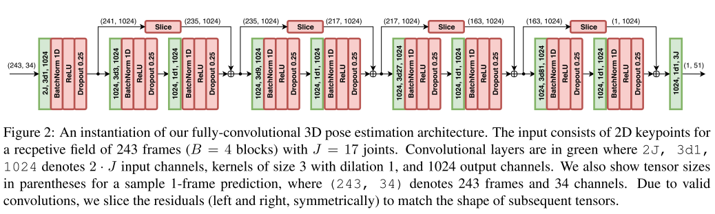 컨볼루션(마지막 레이어 제외) 다음에는 배치 정규화(Batch Normalization), ReLU(Rectified Linear Units), Dropout이 이어지게 된다. 각 블록은 receptive field 를 의 계수 만큼 지수적으로 증가시키는 반면, 매개 변수의 수는 선형으로만 증가하게 된다. 필터 하이퍼파라미터(filter hyperparameters), 및 D는 모든 출력 프레임에 대한 receptive field 가 모든 입력 프레임을 덮는 트리를 형성하도록 설정된다. 마지막으로 마지막 레이어는 시간 정보를 활용하기 위해 과거 및 미래 데이터를 모두 사용하여 입력 시퀀스의 모든 프레임에 대한 3차원 자세 예측을 출력하게 된다.