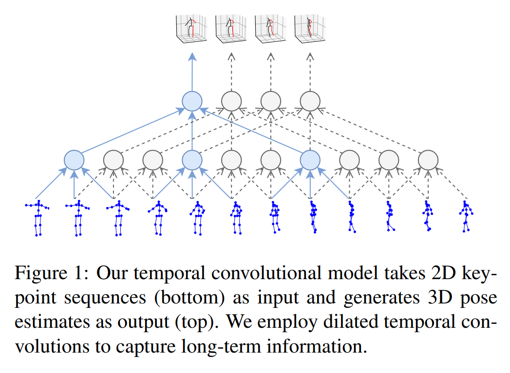 - 2차원 키포인트 궤적(trajectory)에서 dilated temporal convolution을 기반으로 비디오에서 3차원 인간 자세 추정을 위한 간단하고 효율적인 접근 방식을 제시하였다는 것
