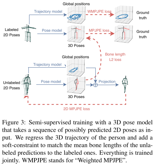 본 논문에서는 공개되어 있는 비디오를 2치원 키포인트 탐지기와 결합하여 back-projection loss term 으로 supervised loss function을 확장한다. 레이블이 지정되지 않은 데이터에 대한 자동 인코딩 문제를 해결하며, 인코더(자세 추정기)는 2차원 관절 좌표에서 3차원 자세를 추정하고, 디코더(projection layer)는 3차원 자세를 2차원 관절 좌표로 다시 투영하게 된다. 디코더의 2차원 관절 좌표가 원래 입력에서 멀리 떨어져 있는 경우 학습되는 동안 패널티를 부여받는다. 그림 3에서는 supervised component 와 정규화 역할을 수행하는 unsupervised component 를 결합하는 방법을 나타낸다.