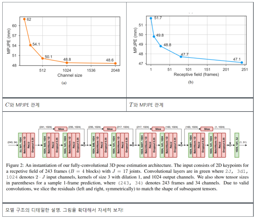 본 논문에서 제안하는 모델은 2차원 자세 좌표를 입력으로 받아 temporal convolution 을 통해 변환하는 residual connection이 포함된 fully convolutional 구조이다. CNN 모델은 배치 및 시간 차원에서 병렬화를 가능하게 하지만 RNN 모델은 시간에 따라 병렬화를 할 수 없다. 컨볼루션 모델에서 출력과 입력 사이의 기울기 경로(path of the gradient)는 시퀀스 길이에 상관 없이 고정된 길이를 가지기 때문에 RNN에 영향을 주는 vanishing 문제 및 exploding gradient 문제를 완화 시킬 수 있다.