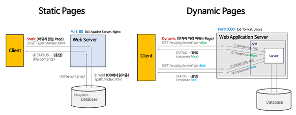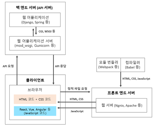 하지만 정적인 요소보다 동적인 요소들을 추가하기 위해(페이스 북처럼 동시에 옆에 방금 로그인한 사람 알려줌/ 페북 메시지 알림 등 동적으로 작동) 백엔드 서버와 프론트 엔드 서버를 구분하게 되었다. (https://it-eldorado.tistory.com/85)