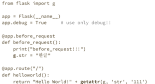 - 예를 들어, before_request 핸들러는 데이터베이스에서 사용자에 대한 로그를 로드하여 g.user에 저장한다.