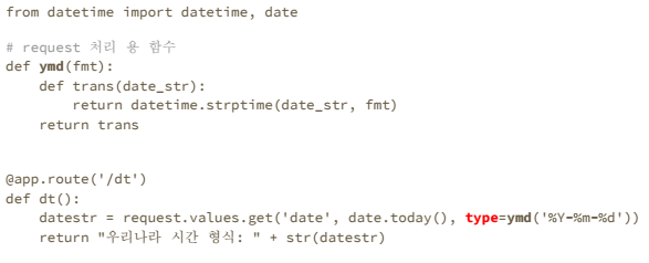 - 플라스크는 라우트에 대해 int, float, path를 지원한다.
