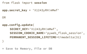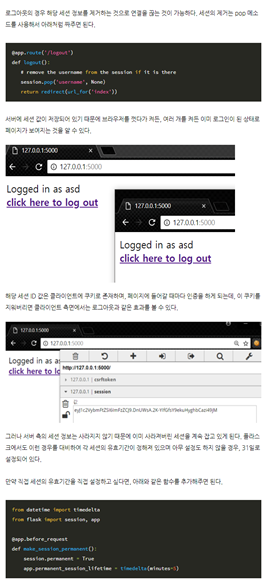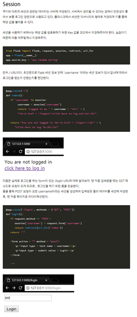 - app.secret_key와 같이 세션을 사용하기 위해서는 해당 값을 암호화하기 위한 Key 값을 코드에서 지정해주어야 한다