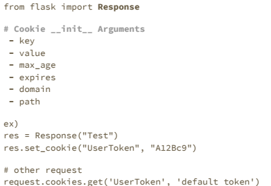 : make_response() 함수를 사용하여 Response 객체를 가져온 후 set_cookies() 함수를 사용하여 쿠키를 저장한다 (make_response() 함수는 사용자에게 반환할 뷰 함수를 생성한 후, 그대로 묶어두는 역할을 한다.)