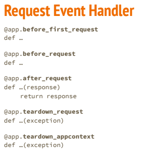 - 모든 뷰 함수에서 이러한 작업을 처리하는 코드를 중복하여 생성하는 대신에 플라스크에서는 옵션을 제공하여 공통 함수를 등록하고 리퀘스트가 뷰 함수에 디스패치되는 전후에 실행되도록 한다.