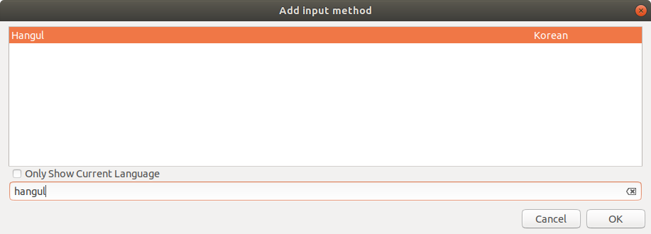 Add input method 창이 뜨면 "Only Show Current Language"에 체크가 된 것을 해제하고 hangul을 입력해서 검색한다.