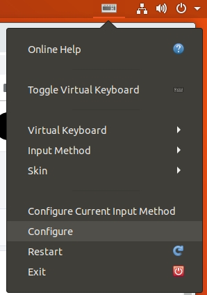 시스템 재부팅~. 재부팅이 완료되면 우상단에 키보드 모양의 아이콘이 보이고 이 아이콘을 클릭하여 configure를 선택한다.