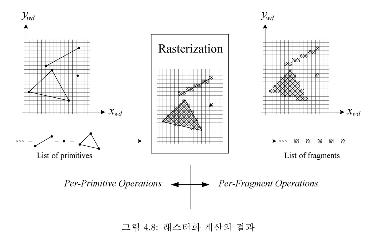 - 래스터화 이전까지의 기하 프리미티브의 연속적인 정보들은 래스터화를 통해 프래그먼트로 변환되고, 래스터화 이후엔 모든 계산이 프래그먼트 단위로 일어난다