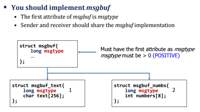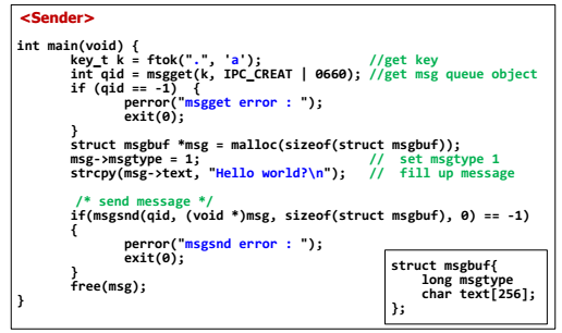 - msgbuf라는 임의의 구조체를 만들어줘서 message queue에 보내줘야 한다!