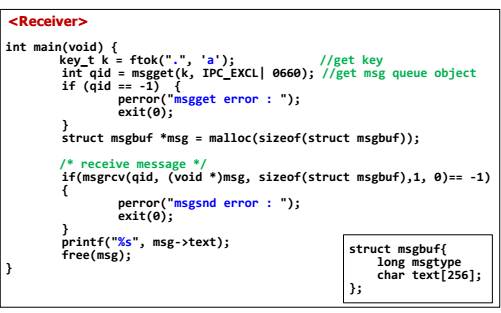 - msgflg : 블록모드(0)/비블록 모드(IPC_NOWAIT)3. msgrcv() : message 수신
