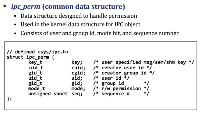 - IPC 객체를 생성하기 위해 공통적으로 사용하는 기본 요소는 키와 식별자=> IPC 객체를 생성하면 다음과 같은 IPC 공통 구조체가 정의된다