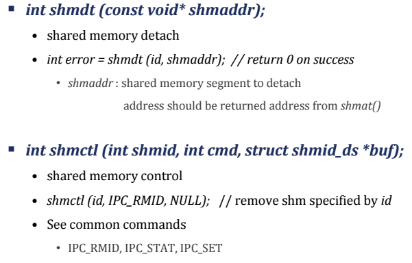 int shmdt(char *shmaddr);- shmaddr : 연결을 해제할 공유 메모리 주소