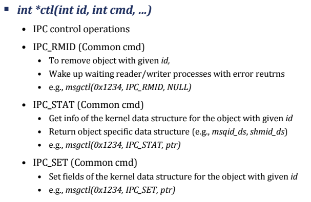 - 0은 사용할 수 없으며, 하위 8bit만 사용되므로 'M', 'S' 등과 같이 문자를 사용할 수도 있습니다.- ctl() : 시스템 V IPC 제어 함수