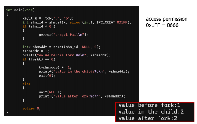 - shmflg : 공유 메모리에 대한 읽기/쓰기 권한