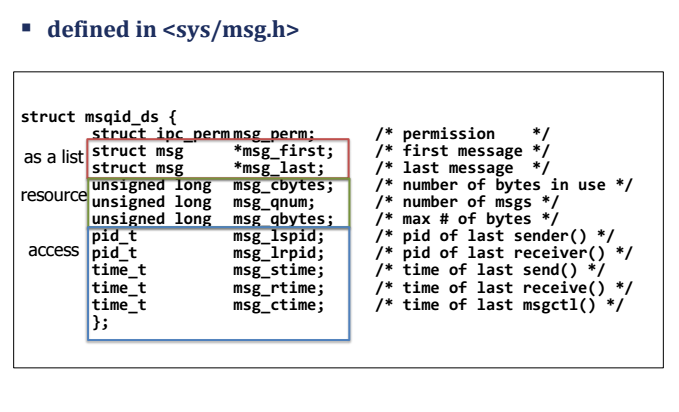 - IPC_SET : 메시지 큐 정보 중 msg_perm.uid, msg_perm.gid, msg_perm.mode, msg_qbytes 값을 세번째 인자로 지정한 값으로 변경